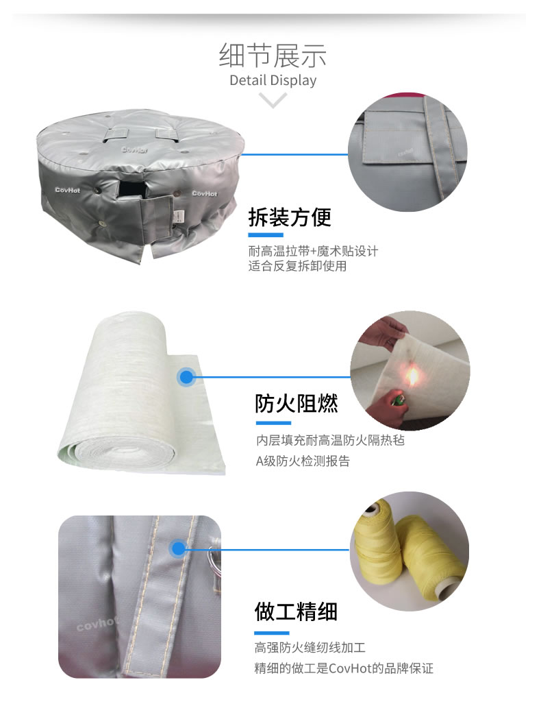 人孔保溫套的特點是拆裝方便、可重復(fù)使用。可防止熱量損耗,降低運行成本,降低故障率,縮短停機時間,節(jié)省寶貴的能源,改善工作環(huán)境,降低人員安裝拆卸成本等。產(chǎn)品耐高溫可達(dá)550℃,保溫隔熱效果好,可以很方便的進(jìn)行人孔設(shè)備拆裝,方便清洗和維護(hù),表面采用可擦洗材料,防水防油,耐腐蝕。可以反復(fù)拆裝使用。